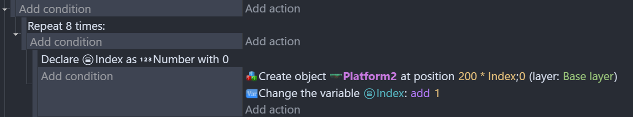 Local variables can also be used within a loop, but in this case its value is reset at every repetition. For instance, the following events create 8 platforms overlapping each other.
