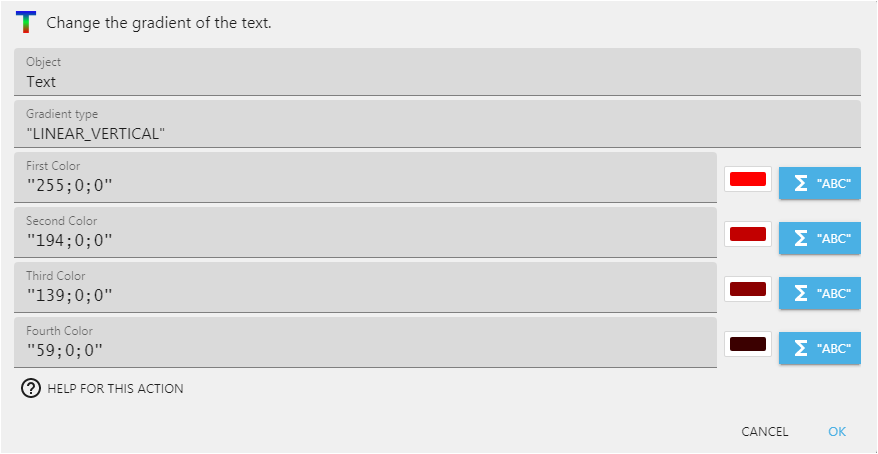 - You can create gradients using the action "gradient". You can choose available gradient types from the provided list and select up to four colors to use.